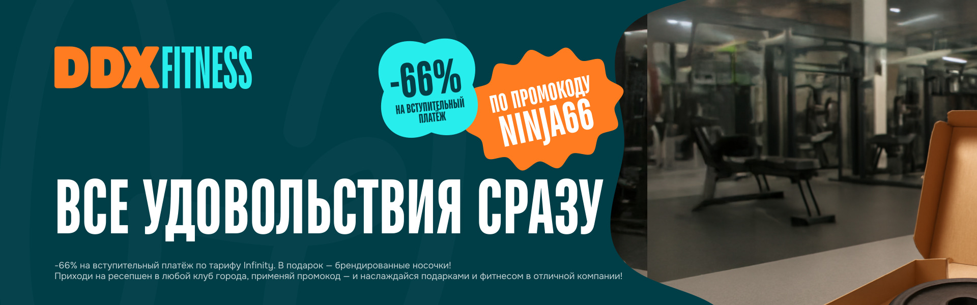 Если у тебя ещё нет активной подписки, оформи ее в любом клубе DDX Fitness в Красноярске. Примени до 23 ноября промокод NINJA66 и получи скидку 66% на вступительный платеж по тарифу Infinity и подарок.